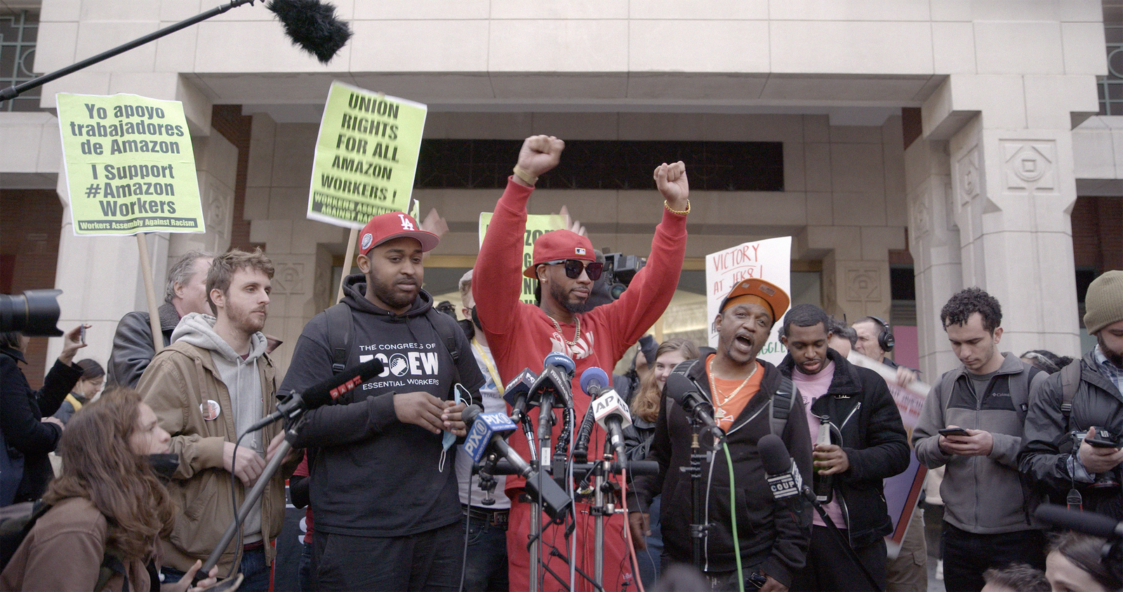 Through intimate cinema vérité, UNION chronicles the extraordinary efforts of an unlikely group of warehouse workers as they launch a grassroots union campaign at an Amazon fulfillment center in Staten Island, New York. Under the direction of the charismatic but underestimated Chris Smalls, the diverse band of workers start the Amazon Labor Union (ALU) and embark on a journey against one of the largest and most powerful companies in the world. The odds are stacked against them, as the group finds itself up against a tech industry giant with unlimited resources, without major support from national unions or politicians, and while navigating internal divisions within their own ranks. Filmmakers Brett Story and Stephen Maing document the struggle from day one, offering a gripping human drama about the fight for power and dignity in today's globalized economic landscape. The film’s participants are Christian Smalls, Angelika Maldonado, Connor Spence, Derrick Palmer, Jason Anthony, Gerald Bryson, Jordan Flowers, Natalie Monarrez, and Madeline Wesley.